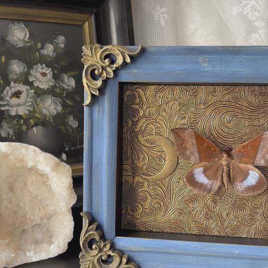 The ornate baroque-style background shimmers with gold detail, creating an ethereal contrast to the moths subtle brown and icy-blue wings. Encased in a distressed blue wooden frame with antique gold ornamental corners, the entire piece evokes the feeling of an enchanted artifact—something you might find tucked away in an apothecary cabinet or hidden within a lunar priestess’s sanctum.