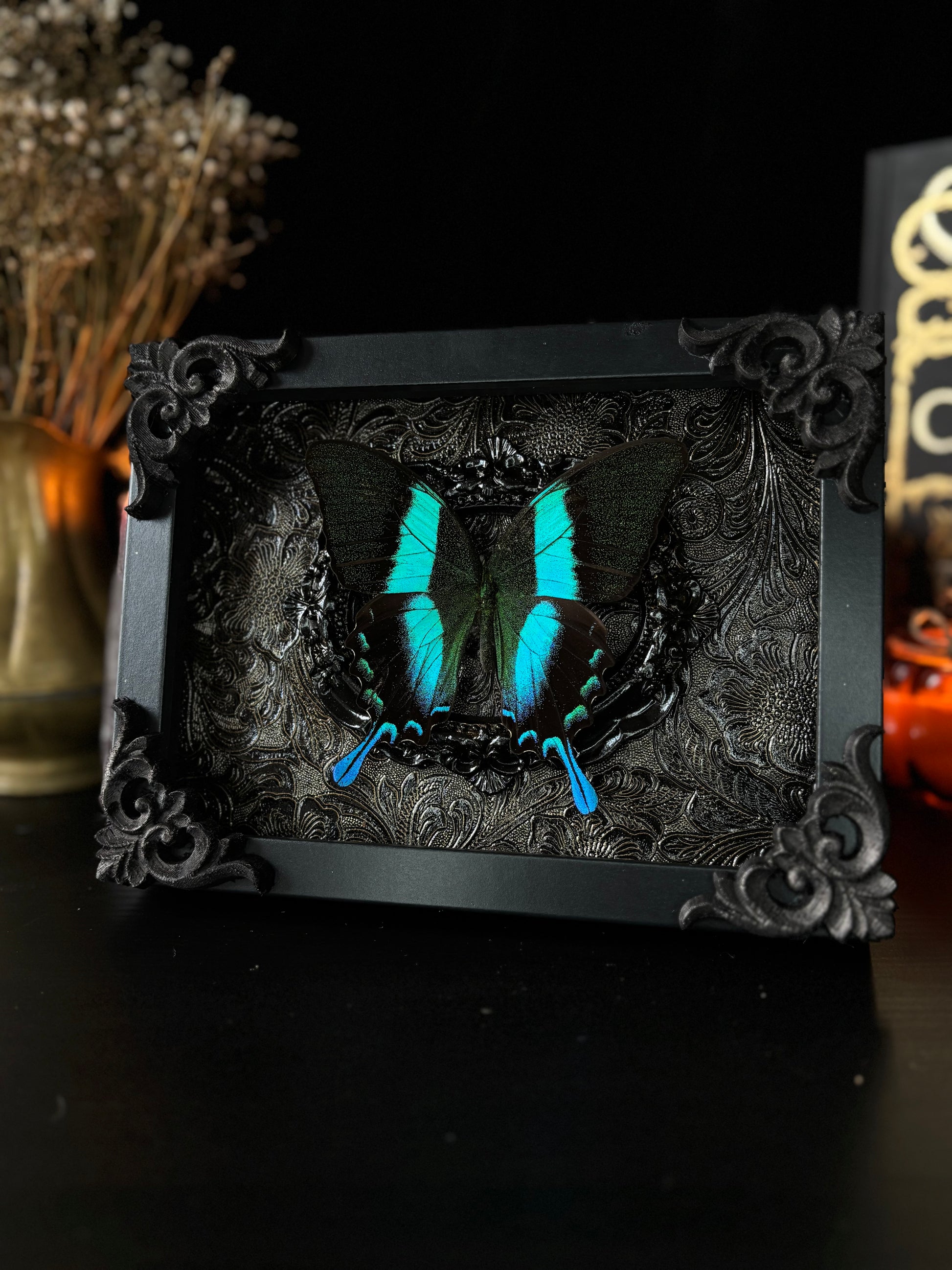 A rare show of iridescence, the Papilio blumei glows in peacock tones of green, teal, and deep blue. This breathtaking specimen is set against a black velvet background that enhances its metallic shimmer, framed in a 20x20 cm black shadow box. Antique gold metal ornaments and a matching engraved nameplate provide a refined, vintage finish. A mesmerizing statement piece full of natural wonder.