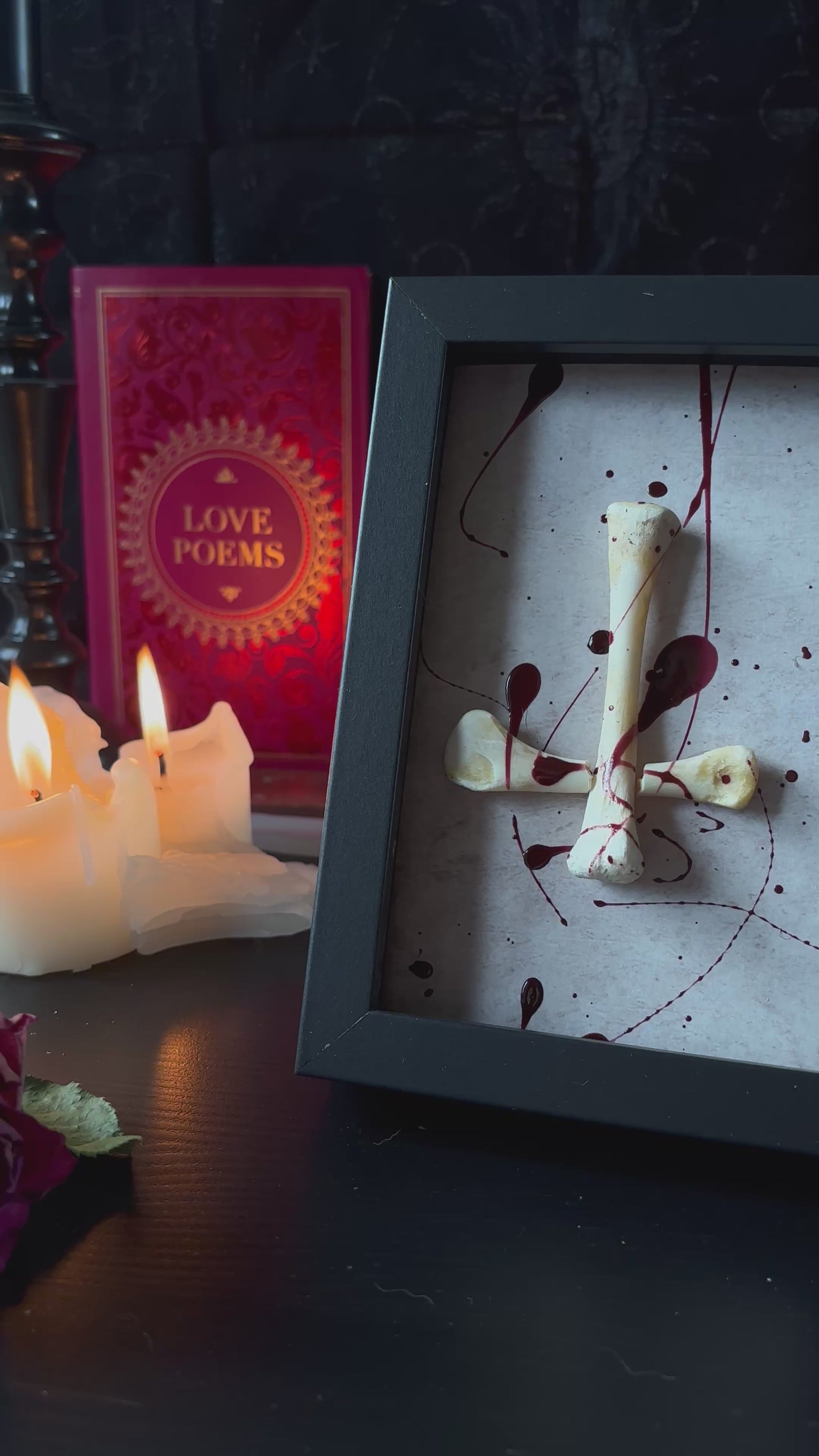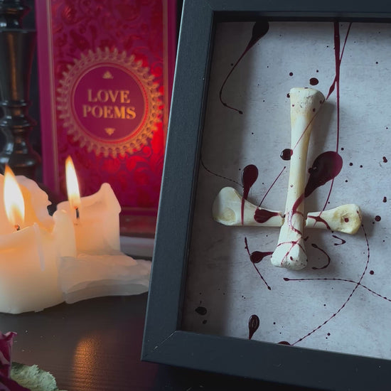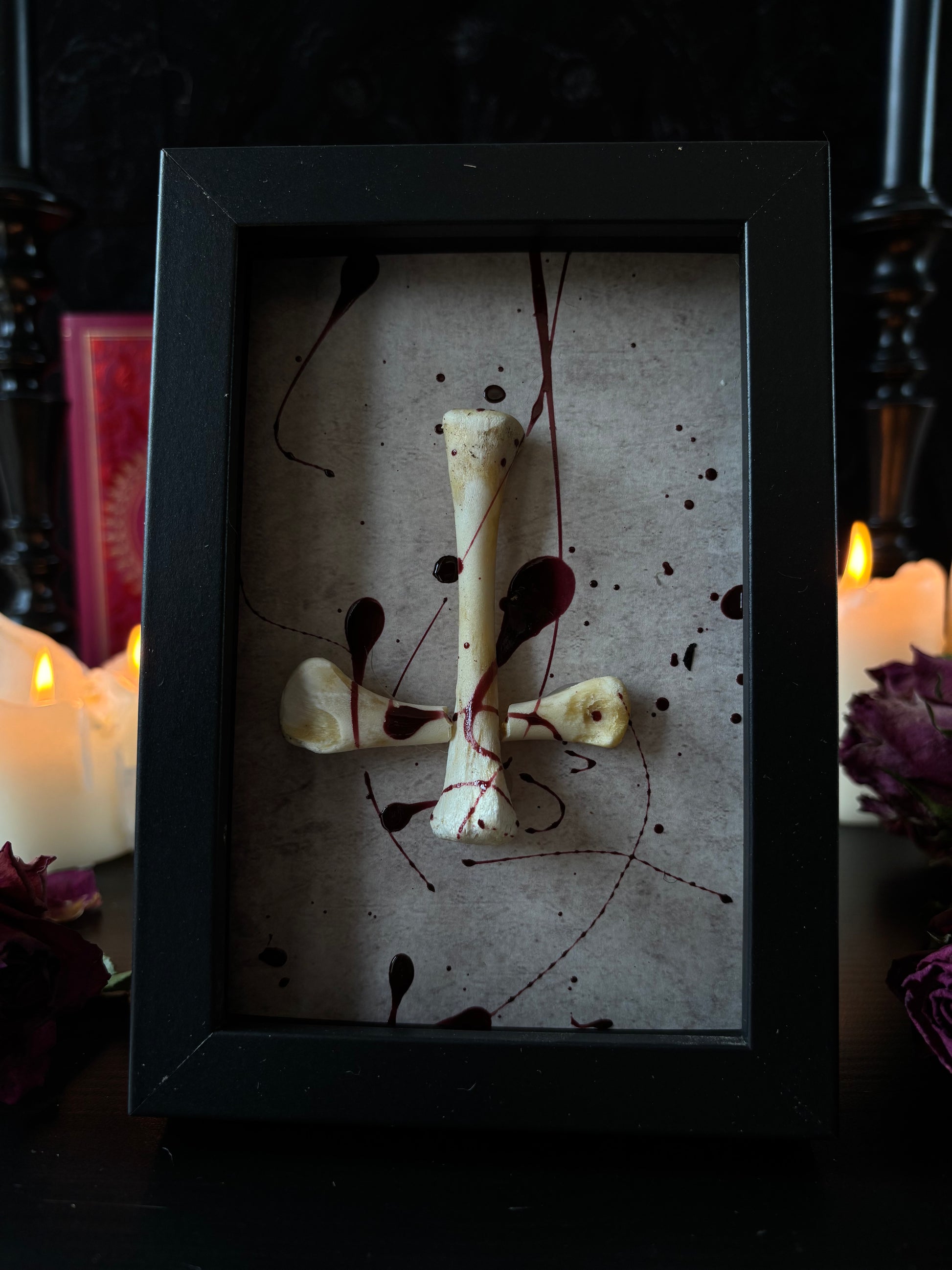 The stark contrast of the delicate wings against the scorched and blood-spattered parchment creates a striking visual tension, echoing themes of transformation, sacrifice, and sorrow. Encased in a sleek black frame, this one-of-a-kind piece is perfect for gothic collectors, ritualists, and lovers of dark romance.