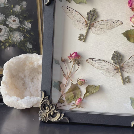 A relic from a forgotten library or a dream you almost remembered—this enchanting piece features two antique-style keys transformed into winged guardians with real cicada wings, giving the illusion they might take flight at any moment.