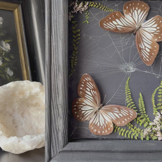 A delicate balance of stillness and flight, this ethereal piece features two ethically sourced butterflies, gently placed in the top left and bottom right corners, as if caught mid-dance in an invisible breeze. Between them stretches a real preserved spiderweb, spun like a veil of memory across a softly textured background.