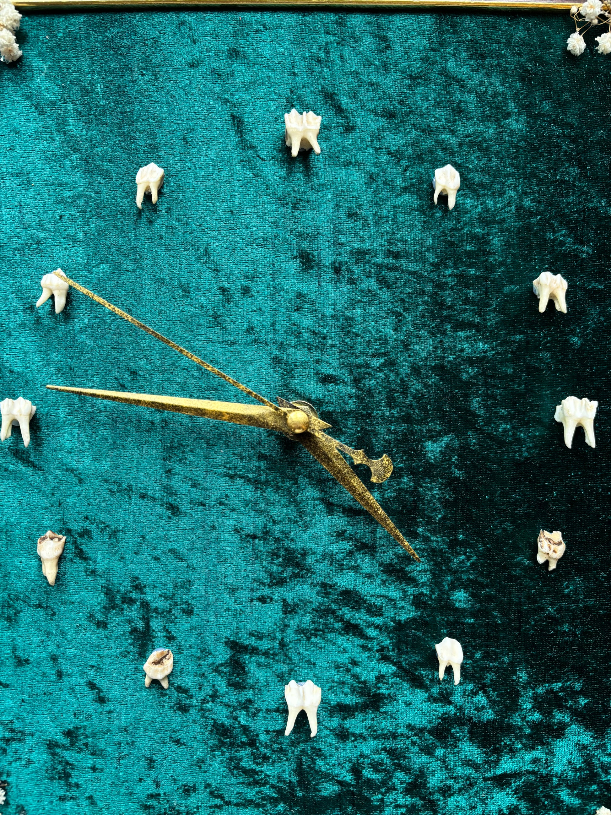- 12 ethically sourced dewe teeth marking each hour