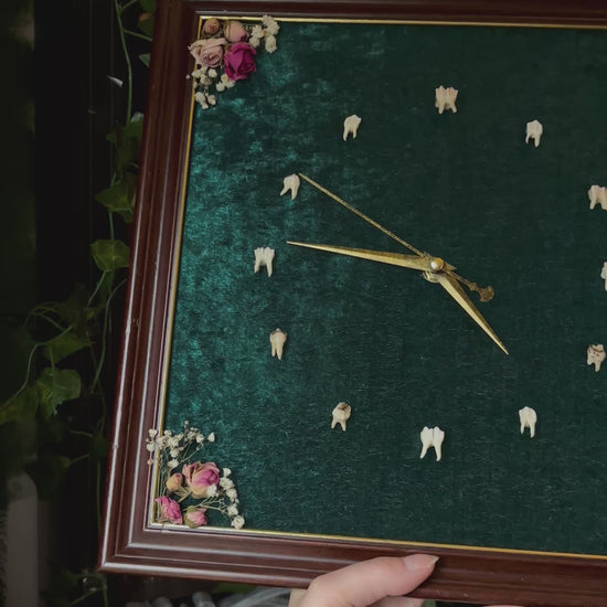 Where time meets the untamed. This one-of-a-kind wall piece features a functioning gold clock set against a deep forest green satin background, framed in a vintage frame that echo antique elegance. Each hour is marked by an ethically sourced fox tooth, forming a circle of wild precision and primal beauty.