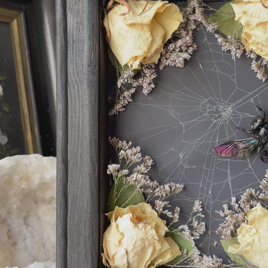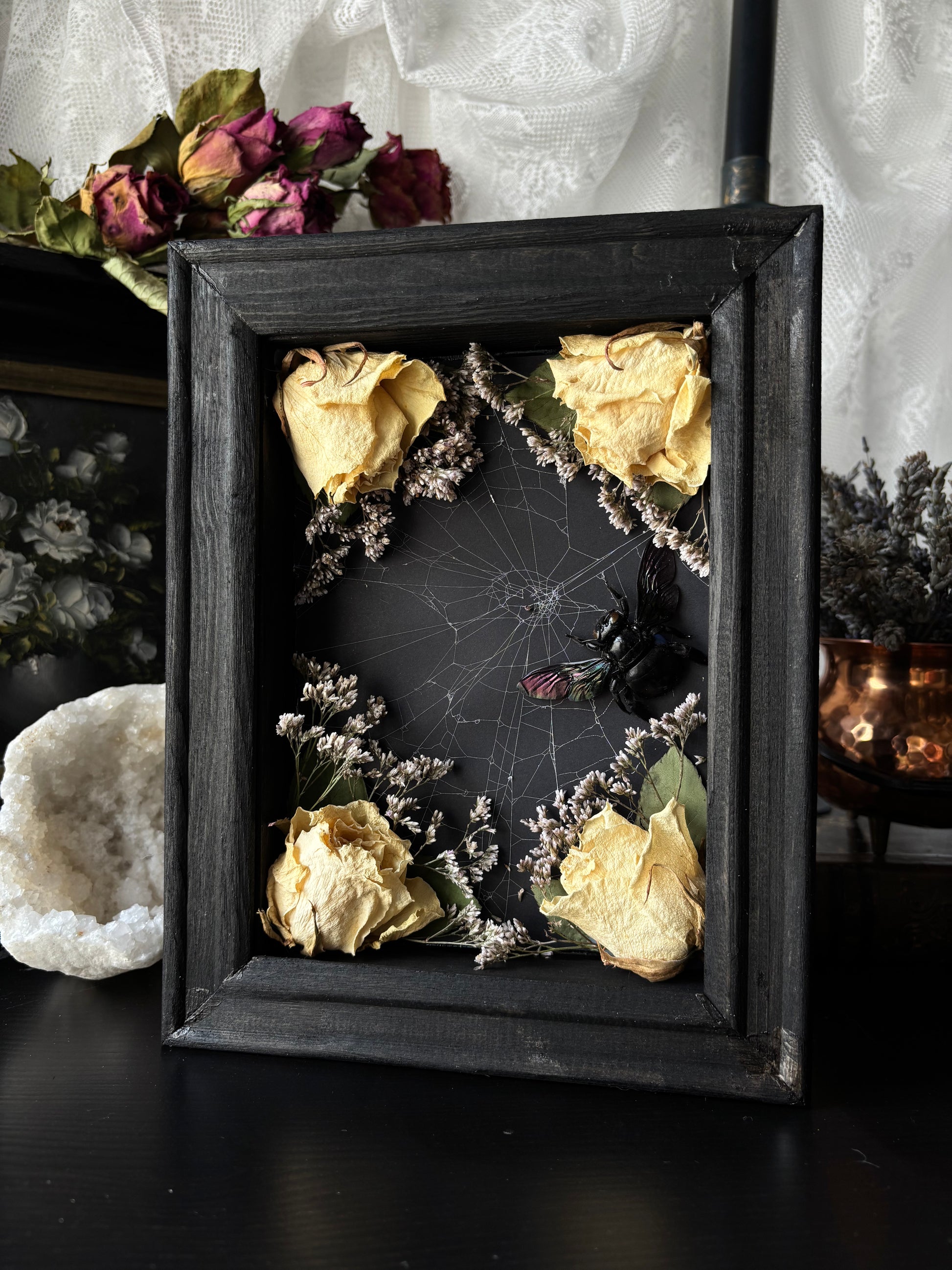 Framed in matte black wood, the piece is grounded by dried rosebuds nestled in each bottom corner, evoking an altar to time, transformation, and memory. The combination of wing, web, and wilted bloom creates a moody, gothic tribute to the fragile beauty found in forgotten corners of the world.
