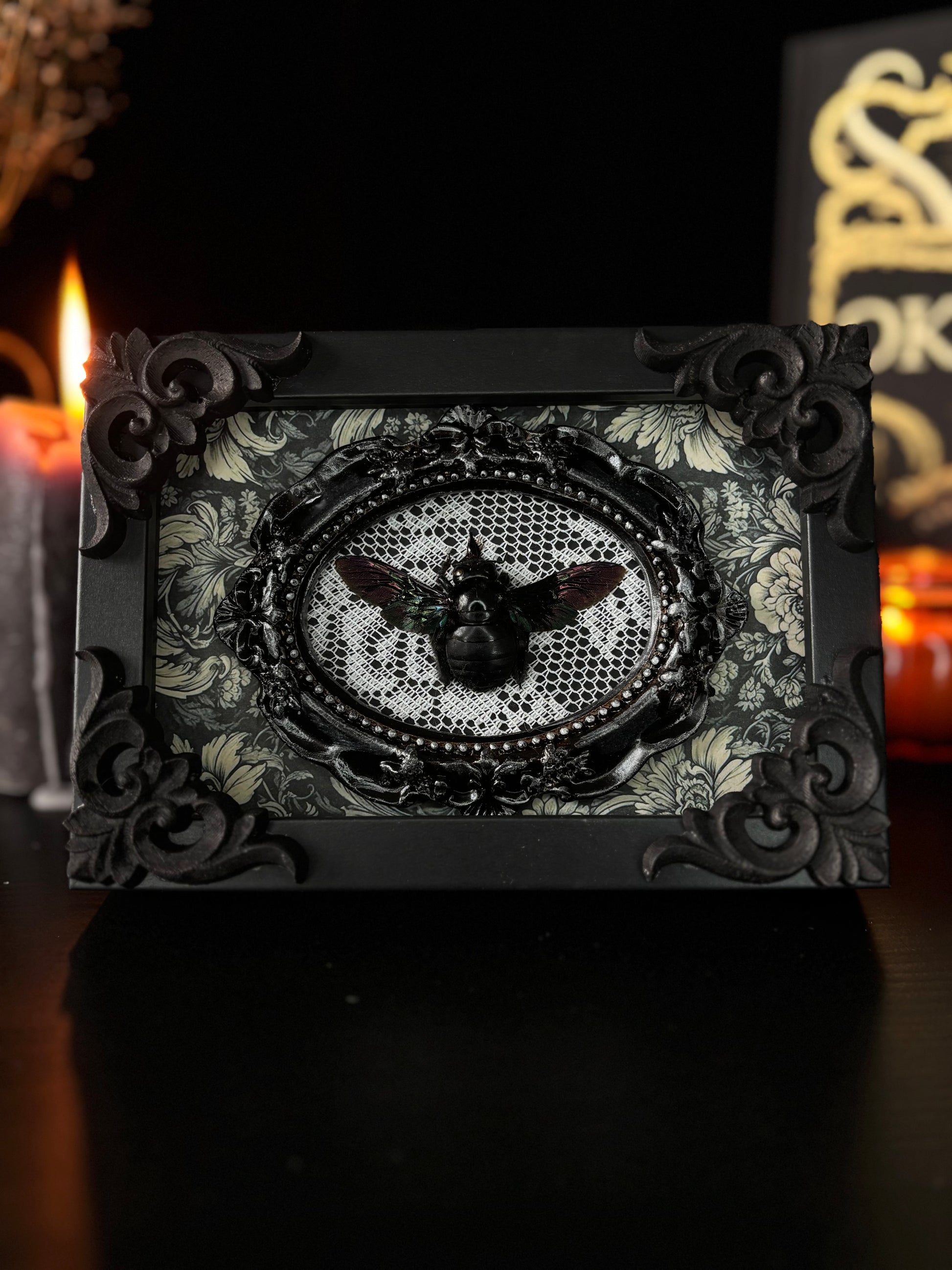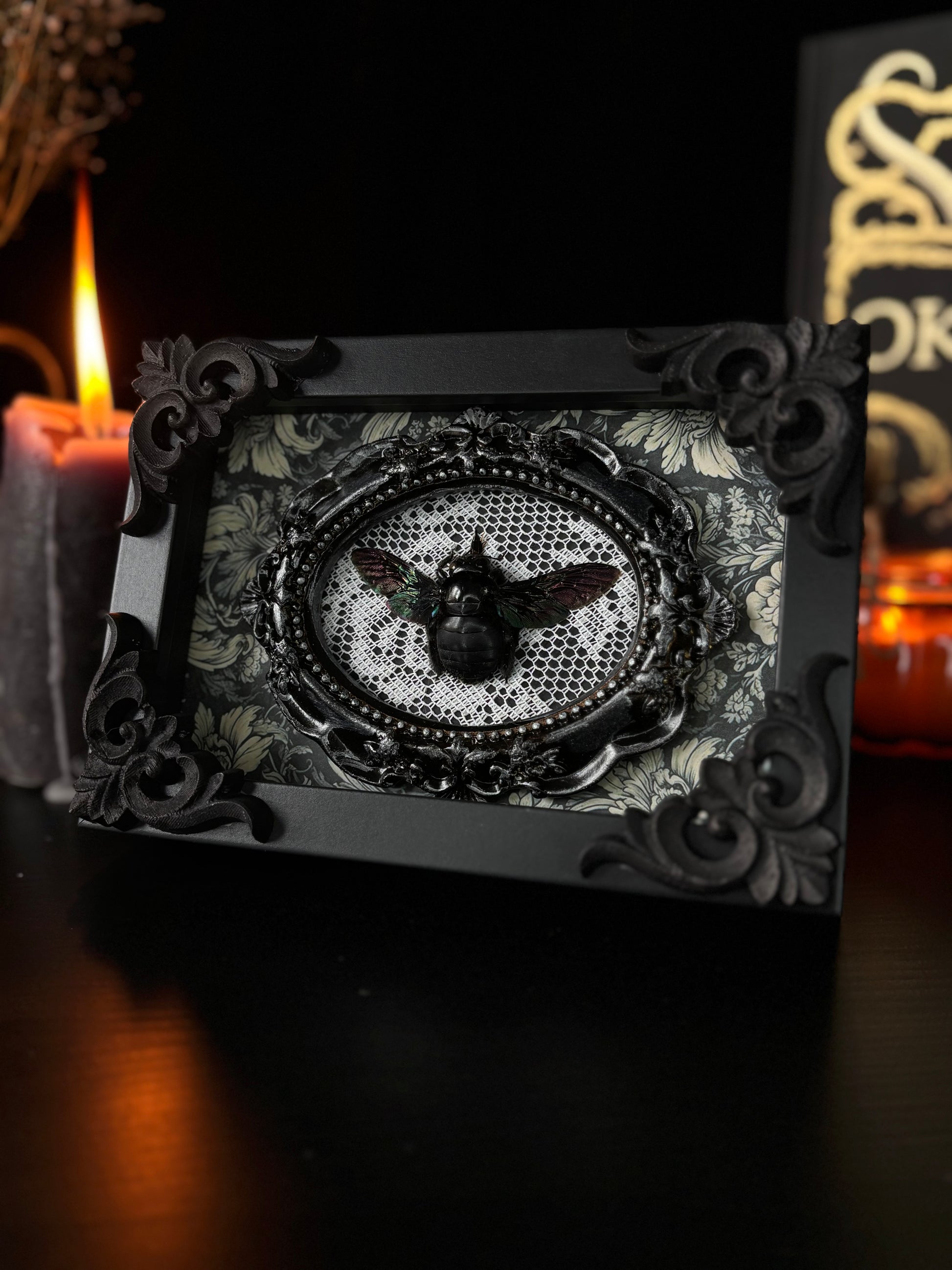A delicate balance of strength and softness, this framed display features a powerful Xylocopa latipes (giant carpenter bee) at its heart, resting within an oval black resin frame lined with soft white lace. The inner frame evokes the feel of a Victorian mourning brooch—ornate, feminine, and reverent.
