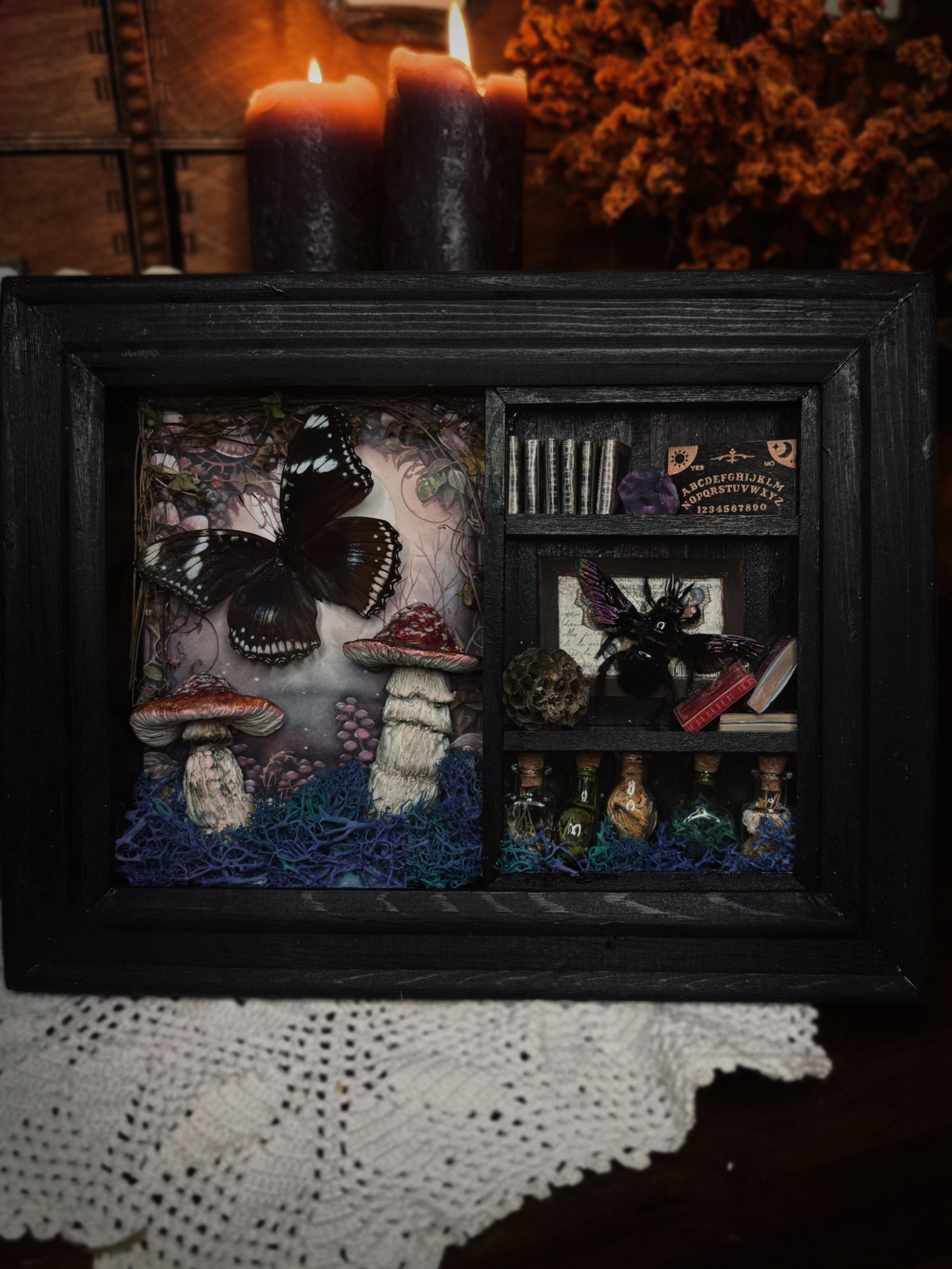 Enter the Forbidden Forest — a realm where spellcraft and nature entwine beneath the moonlight. This handcrafted shadowbox captures the essence of dark woodland magic, featuring a real preserved butterfly and beetle surrounded by miniature curiosities and potion bottles.